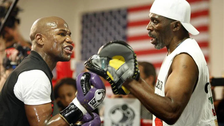 - Pad Work with his uncle Roger Mayweather: Perhaps the most iconic part of his training, Mayweather would go through at least 5–12 rounds (straight and with no rest), of intense mitt work. This fast-paced exchange of punches and defences helped Floyd sharpen his reflexes, combinations, and timing. Floyd would also alternate this pad work with punching the ‘body shield’, a belt worn around one of his trainers, to practice punching his body shots and further enhance his power and precision.